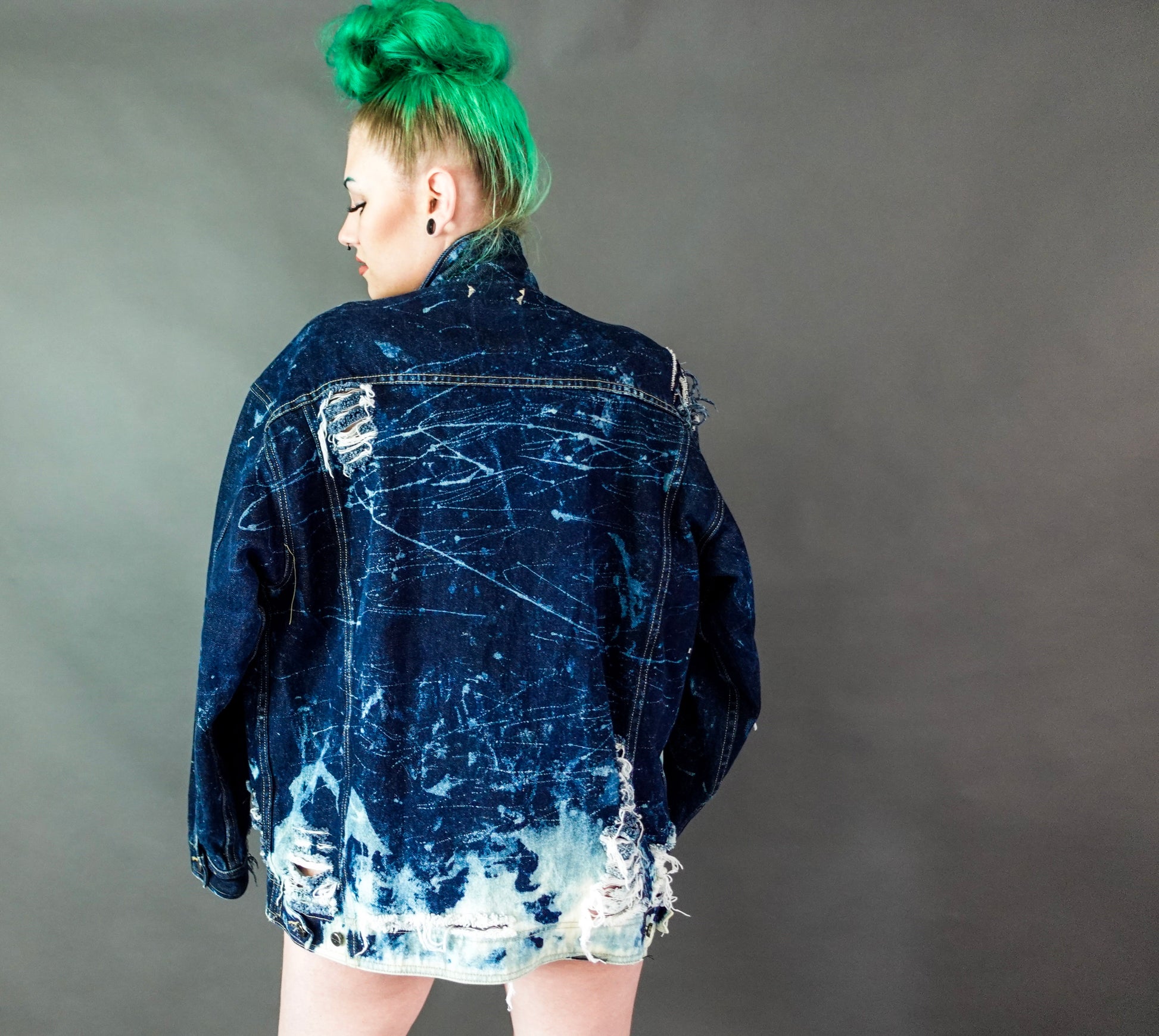 Interested in custom jacket head over to Elevate your style with the Denim jacket a hand distressed and bleached jacket with a versatile fit for sizes 2-14. Perfect for any occasion, pair it with thigh-high boots or sneakers and a fedora. Preorder now and use #kissedbybo for a chance to be featured! Custom options available.