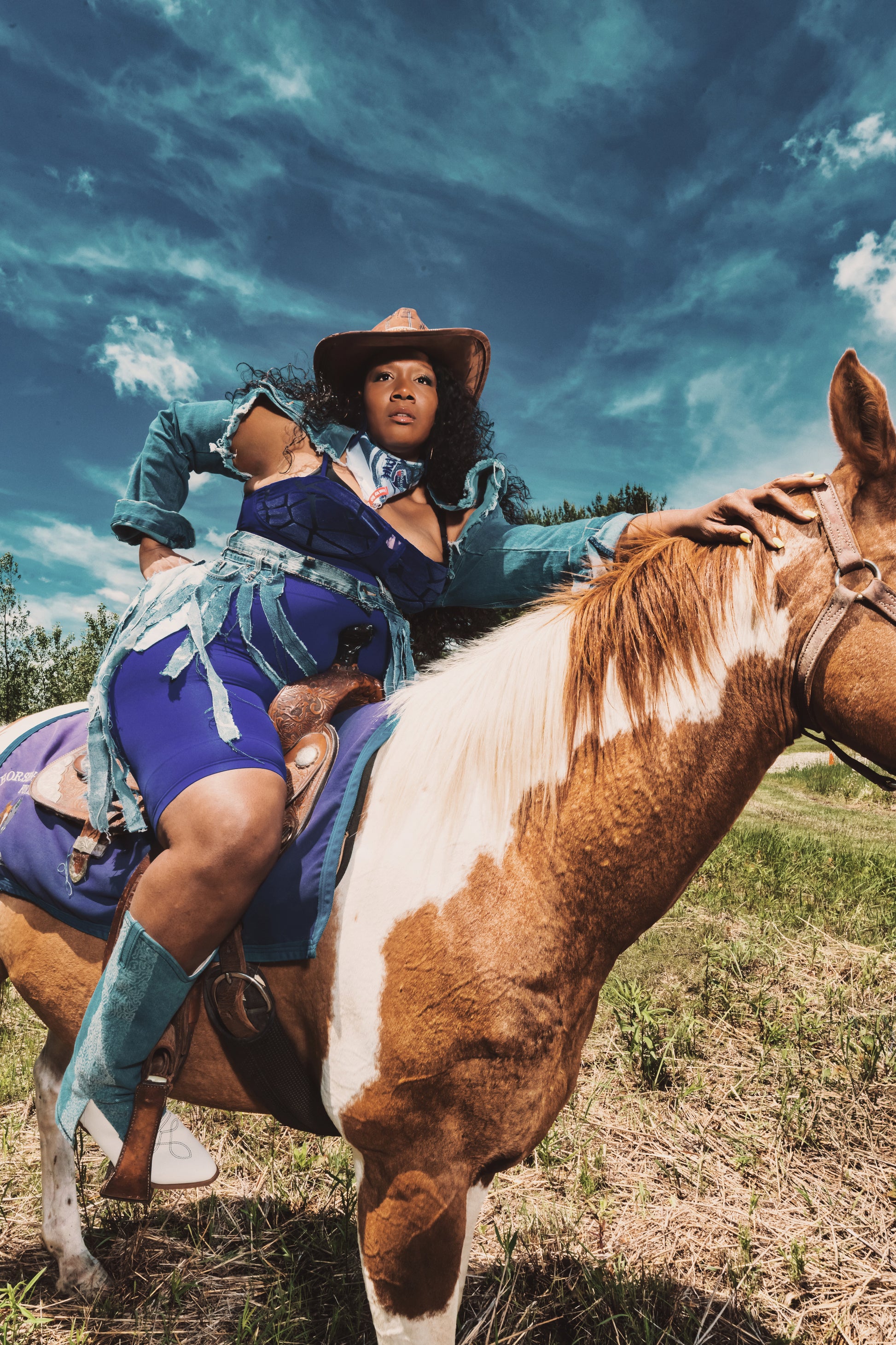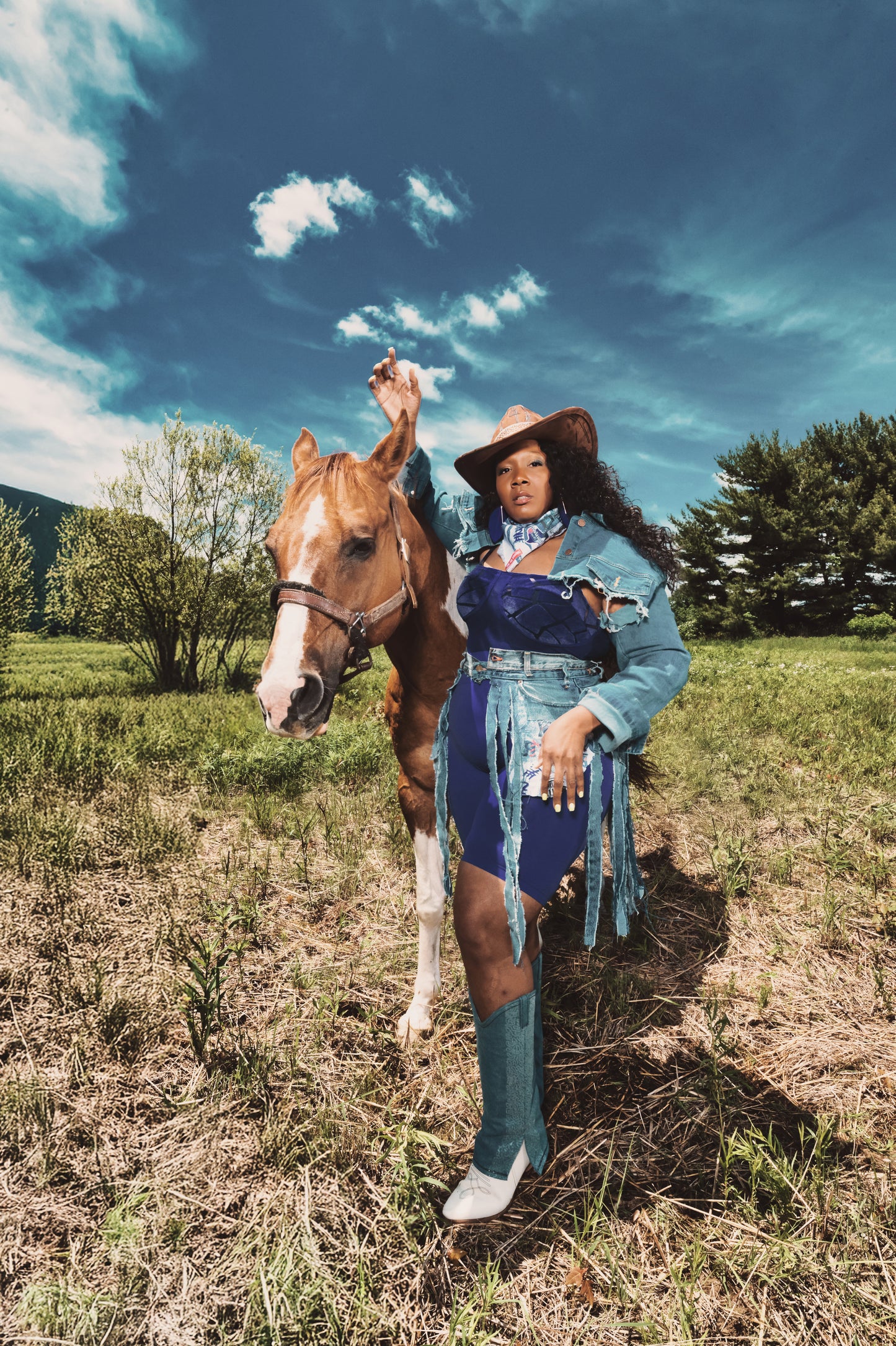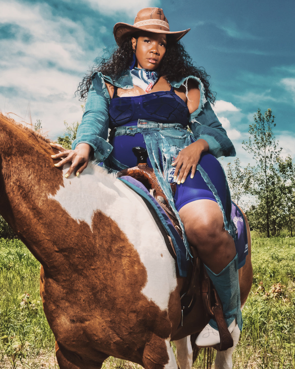 Crafted from recycled premium denim and finished with luxe hand-cut fringe, this hybrid piece moves with you—just like the rhythm of a southern beat. The standout pocket detail features a discreet Cowboy Carter-inspired motif, adding a nod to modern cowgirl royalty.