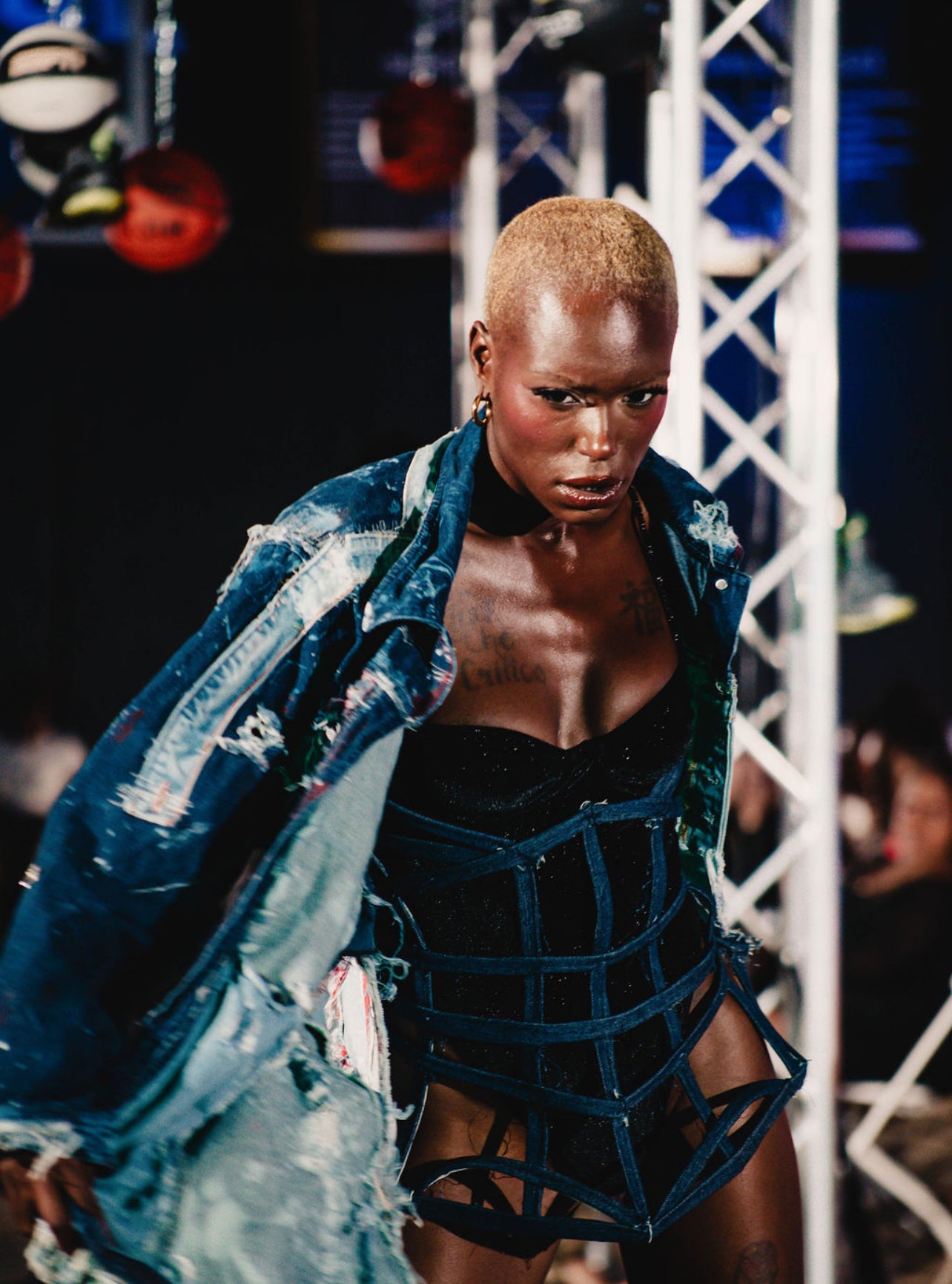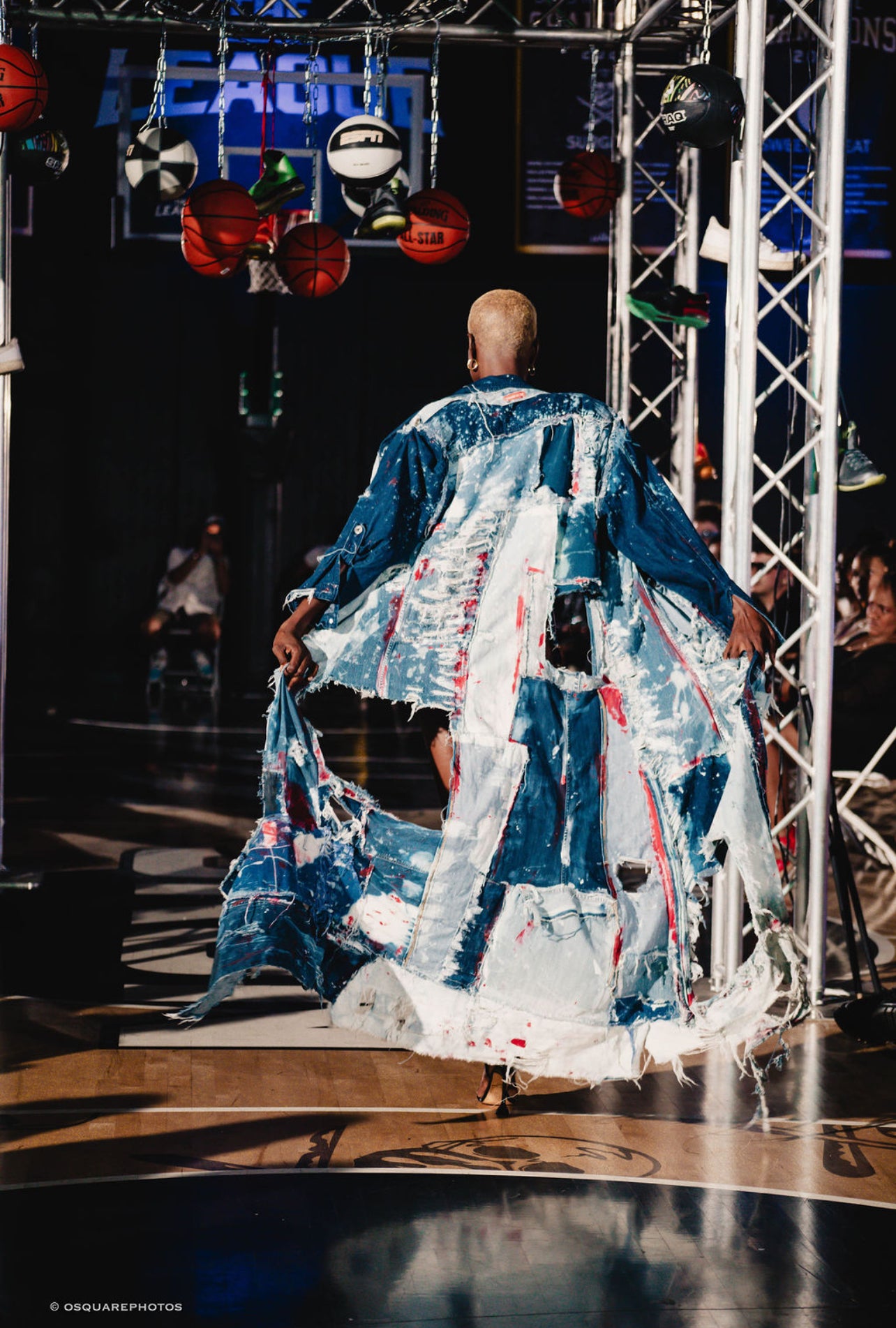 The jacket’s design is punctuated with bold embellishments: stray denim patches, random buckles, and an exaggerated collar that command attention from every angle. A dramatic train extends the silhouette, while large gaping holes at the back add a fearless, deconstructed edge.